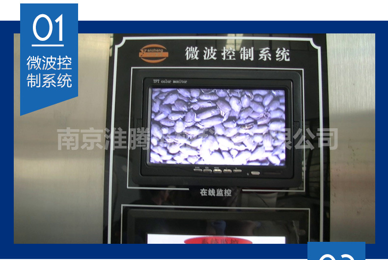 1、易于控制:配有PLC自动程序控制系统,装有人机界面的触摸屏,自动监控加热温度、加热时间、微波密度、具有故障报警系统,可实现数据存储的傻瓜式操作。