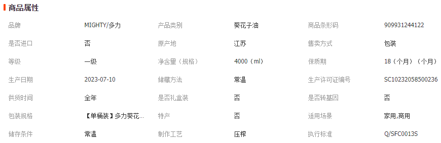 多力葵花籽油4L 物理压榨一级食用油充氮保鲜富含维生素E