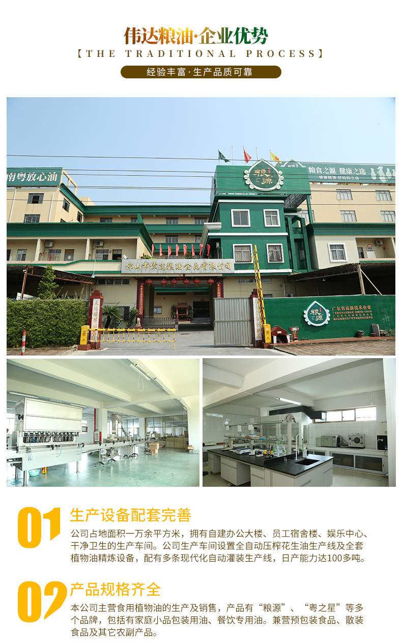 佛山市伟达粮油食品有限公司,创办于一九八九年八月。坐落在南海区九江镇龙高路工业园敦根段,公司距G325国道、佛开高速公路出口3公里,西靠高明城区,北靠西樵山,南临九江镇,水陆交通十分便利。公司占地面积一万余平方米,拥有自建办公大楼、员工宿舍楼、娱乐中心、干净卫生的生产车间。公司生产车间设置全自动压榨花生油生产线及全套植物油精炼设备,配有多条现代化自动灌装生产线,日产能力达100多吨。公司拥有一批管理人员和专业技术人员,是一家集研发、生产、销售为一体的实业公司。